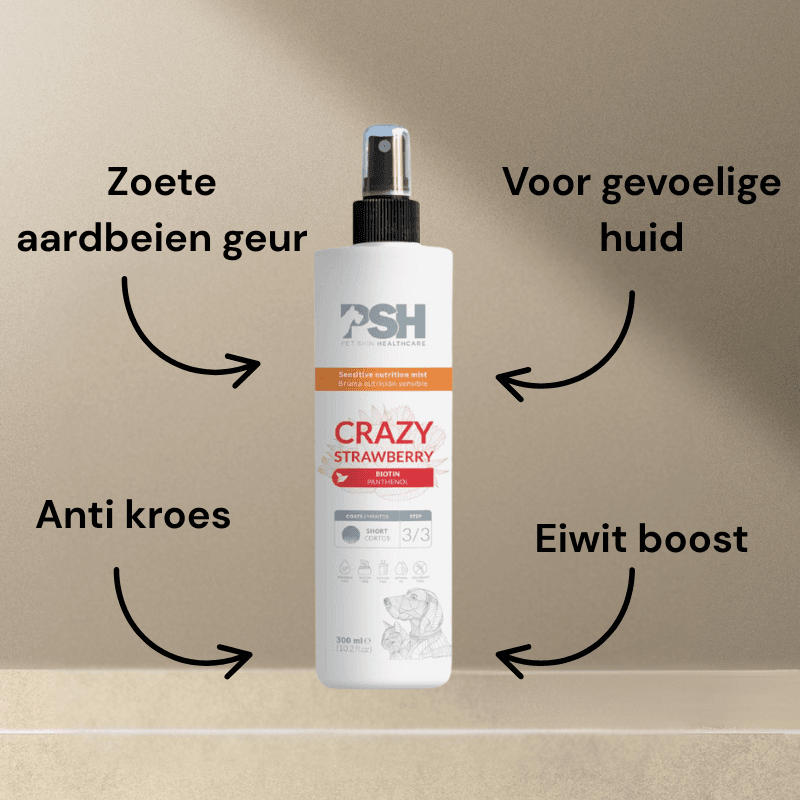 PSH Crazy Strawberry Mist Spray is een lichte leave-in conditioner, speciaal ontwikkeld voor honden en katten met een korte vacht en gevoelige huid. Gehydrolyseerde gist en keratine-achtige eiwitten hydrateren, versterken en geven elasticiteit aan de vacht. Deze unieke samenstelling voedt de haarzakjes en houdt de huid gezond, waardoor het product uitermate geschikt is voor huisdieren die gevoelig zijn voor irritatie, roodheid of droogheid.