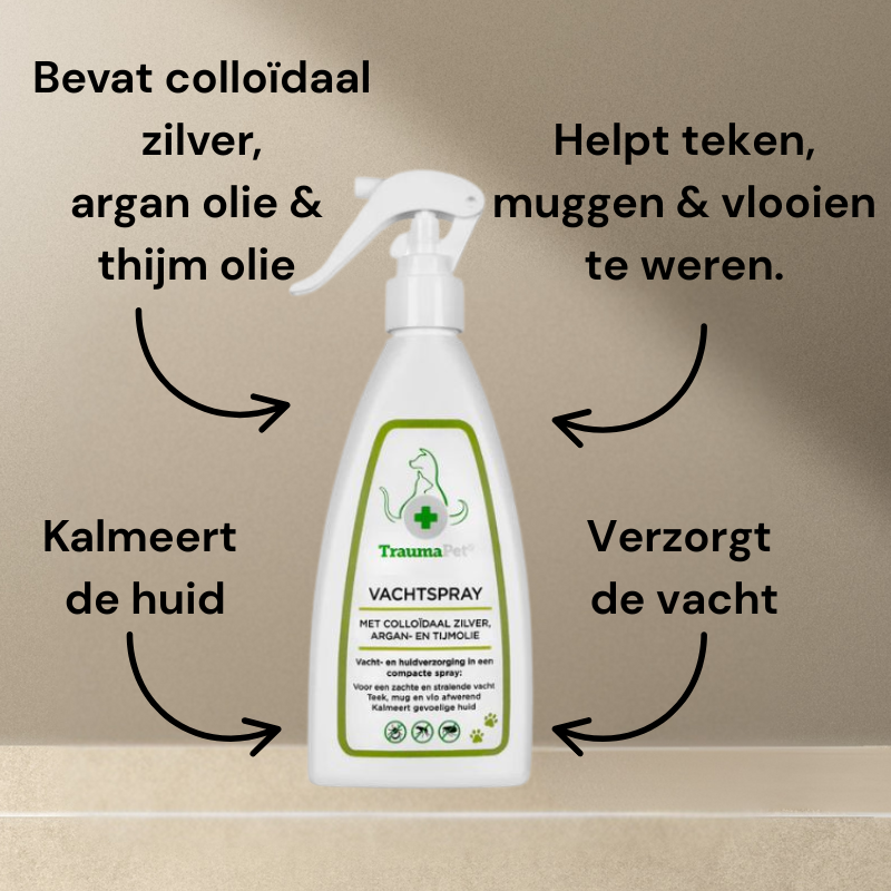 TraumaPet Vachtspray is een verzorgende en beschermende spray voor de huid en vacht van je huisdier, met een unieke mix van colloïdaal zilver, arganolie en tijmolie. Deze natuurlijke samenstelling kalmeert de huid, verzorgt de vacht intensief en helpt tegelijkertijd om teken, muggen en vlooien te weren – zonder chemische toevoegingen.