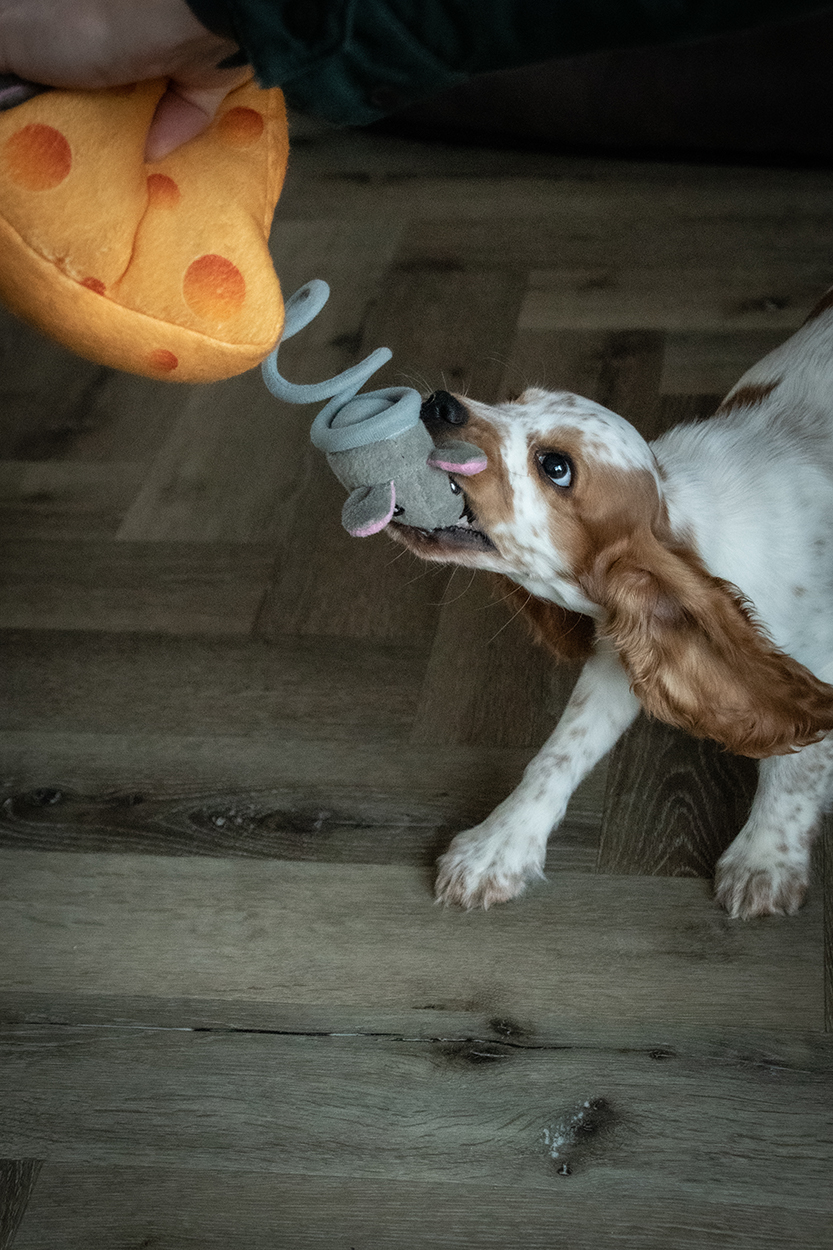 Met Double Wobble Cheesy Comrades geef je je hond een uniek, piepend en superzacht speeltje dat voor pure chaos en vreugde zorgt – de ultieme bandversterker voor baasje en viervoeter!