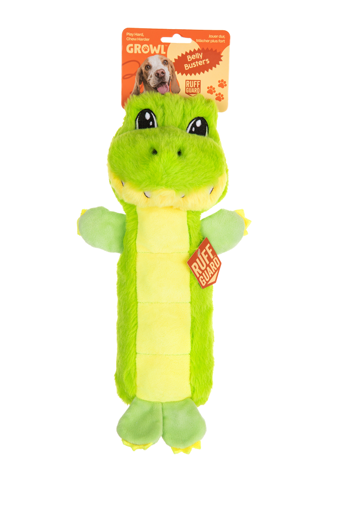Gemaakt van stevig pluche met Ruff Guard Technology – versterkt 1080D denier-materiaal en nylon stiksels op alle kwetsbare punten – combineert Gary moerasgroene kleuren met professionele duurzaamheid. De lange krokodillentail, scherpe tanden en sterke kaken zijn ideaal voor schudden, gooien en trekspelletjes. Geschikt voor alle hondenrassen en leeftijden.