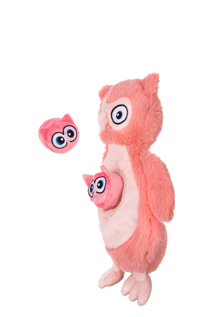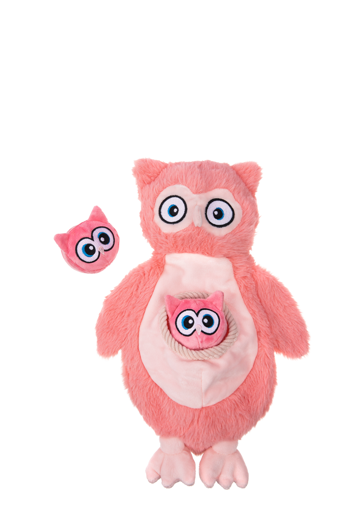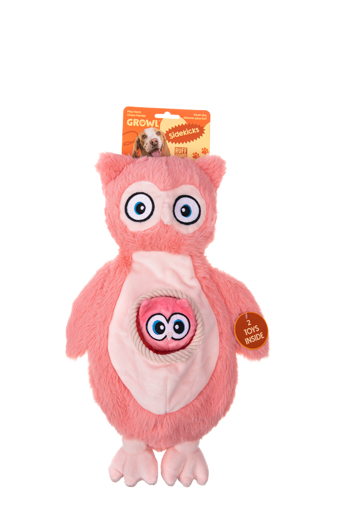 De Growl Sidekicks Hoot en Hootlet is een roze uil met meerdere piepers ÉN twee verborgen baby-uiltjes voor nachtelijk graaf- en ontdekplezier! Dit slimme burrow-design met grote kop-pieper + twee mini-Hootlets in de buik daagt je hond uit om te snuffelen, graven en de kleine uiltjes te vinden – perfect voor nieuwsgierige kauwers die van nachtelijke speuravonturen houden!
