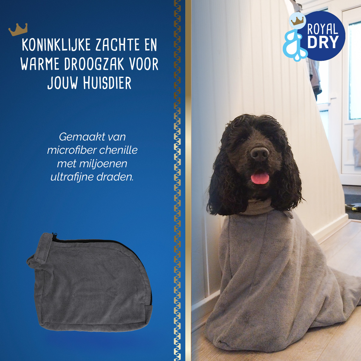 Royal Dry Doggy Bag Droogzak S (ruglengte 40 cm) is een superabsorberende microvezel droogzak voor kleine tot middelgrote honden die water opzuigt als een spons – houdt huis, auto en meubels droog na wandelingen of baden. Deze handige droogzak met rits is geschikt voor alle vachtsoorten en houdt je hond warm tegen onderkoeling.