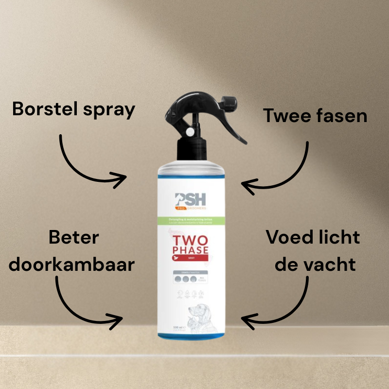 De PSH 2 Phase Lotion Mist is een natuurlijke, lichte borstel spray, ontwikkeld om de vacht makkelijker doorkambaar te maken zonder te verzwaren. Dankzij de twee fasen – een waterige en een olieachtige laag – wordt de vacht licht gevoed én direct makkelijker te borstelen, ideaal voor dagelijks onderhoud of als snelle opfrisser tussen trimsessies in.