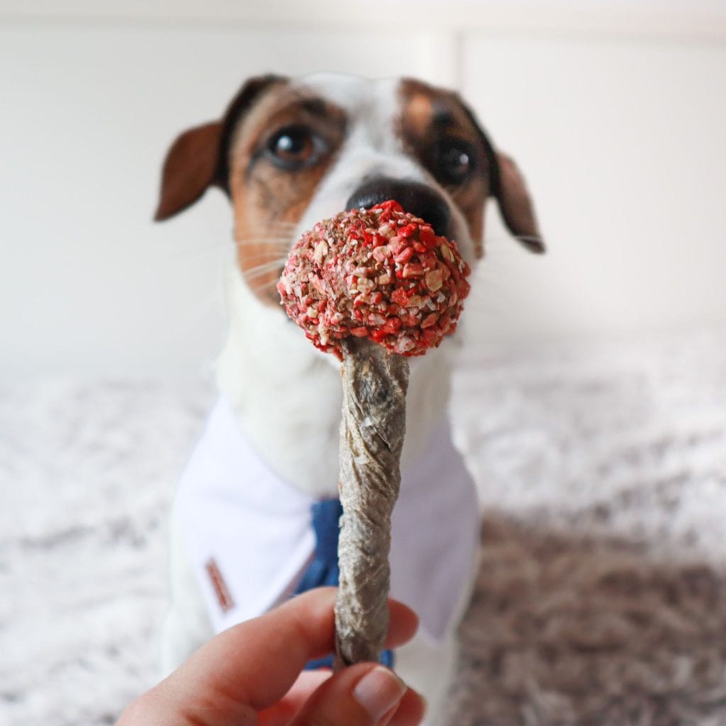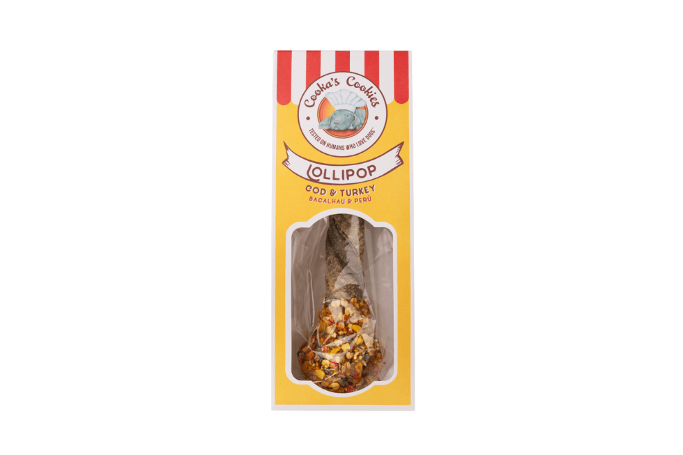 De Lollipop Chewy Pop van Cooka’s Cookies is een unieke hartige traktatie die 100% human-grade verse kalkoen combineert met een knapperige ‘pop-stick’ van gedroogde kabeljauw huid. De kabeljauwhuid is een natuurlijke Omega-booster die bijdraagt aan een gezonde huid en een glanzende vacht. Elke pop wordt met de hand vervaardigd in Cooka’s Kitchen en afgetopt met vrolijke ‘dogfetti’ voor extra feestvreugde.